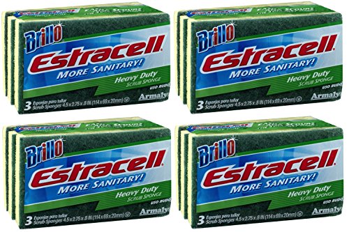 The Estracell Heavy Duty Scrub Sponge is a work horse around the home. While the aggressive green scour surface removes burned on foods and grease from cast iron pots and pans, the Estracell Sponge side easily wipes up and rinses dirt and food particles down the drain. It can also be used in tough-to-clean places like the garage or basement workshop, cold barbeque grills and steel grill tops. Independent test results demonstrate that bacteria will not feed and survive on the sponge fibers of Estracell sponge material...Naturally. Also, the unique cell structure rinses cleaner and dries out faster, eliminating the perfect breeding condition for bacteria and fungal growth. These qualities make Estracell...More Sanitary.Pack of 12 sponges (4 X 3 Count Packs)