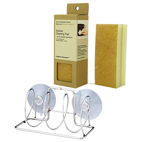 Store you favorite Goodbye Detergent scrubbing tools quickly, efficiently, and stylishly with this sponge rack and dryer. It is made of durable and sleek stainless steel that resists rust, and keeps all your sponges, scrubs and pads separate and easy to grab while cleaning. Because the rack holds sponges apart, they will dry quicker to prevent mold and mildew. The holder comes with two suction cups so you can mount it in your sink for easy access. Cleaning pads, made from sustainable and environmentally-friendly materials are tough on stains. Because the pads come in 100% recycled package and require no detergent, they're gentle on the environment too! A cleaning pad for every need - stainless steel/granite, enamel, anodized aluminum & heavy duty ;All kitchen cleaning pads except for Heavy Duty have a scrubbing side and a sponge side ;Heavy Duty pads are a good alternative to steel wool ;Designed to... 3-piece set includes: stainless steel scrub holder and 2-piece kitchen cleaning pad, anodized aluminum3-piece set includes: stainless steel scrub holder and 2-piece kitchen cleaning pad, anodized aluminum