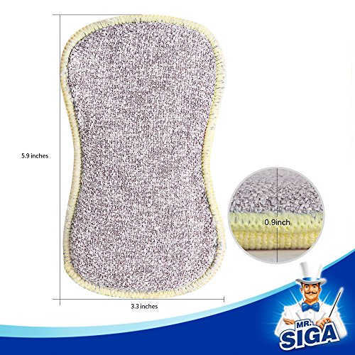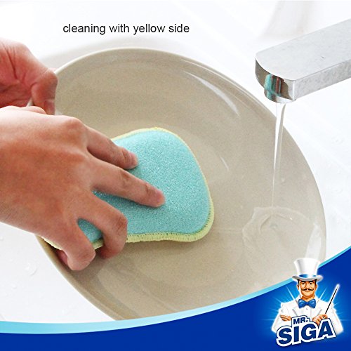 MR. SIGA Dual Action Scrubbing Sponge, Pack of 6. The multi-purpose and durable sponge is ideal for use in Dish washing, kitchen & bathroom. Different scrub levels on two sides are designed for various surfaces, and can be used to remove hard dirt, oil, grease easily. The curved design and assorted colors make rooms bright in style.
