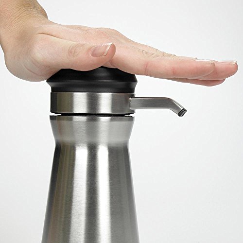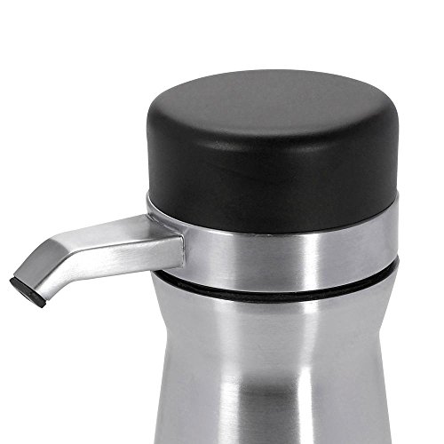 OXO's stainless steel easy press dispenser offers an easy-dispensing mechanism combined with elegant design. A non-slip top button makes it easy to squirt hand soap, lotion or dish soap using one hand and the extended spout easily dispenses onto a sponge or directly into the sink. The brushed stainless steel body features a non-slip foot to keep the pump dispenser stable during use and a clear window to show the contents. When it's time to refill, simply Unscrew the top and pour into the wide opening.Easy one- or two-handed dispensing of Hand soap, dish soap or lotion