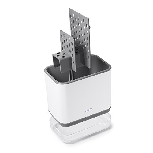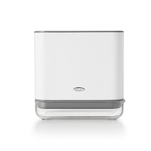 Tackle washing dishes once and for all with a Sinkware caddy that does double duty. This crock-style organizer has two compartments designed for squeaky clean storage. The first compartment stores brushes and cleaning tools upright for easy access; the second has a, elevated sponge tray to keep two sponges or scrubbies dry and super handy. Both are perforated for airflow and to wick water away. Cleaning the caddy is a cinch too, thanks to the removable drip dray with built-in spout.Crock-style organizer for storing a variety of cleaning tools