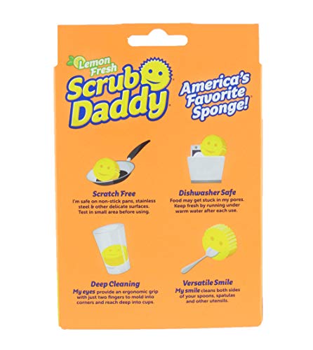 Scrub Daddy Lemon Fresh delivers the same great cleaning properties as The Original with an added sweet citrus aroma! Exclusive FlexTexture foam changes texture based on water temperature: firm in cold water for tough scrubbing and soft in warm water for light cleaning. He works so well with water alone many times you can skip using a chemical detergent. Unlike traditional sponges, Scrub Daddy resists stains, mold, and odors while never scratching your surfaces. And if you thought that smiling sponge was just for looks, think again! His eyes hold onto your fingers for a 360 degree reach (great for tall glasses) and his mouth cleans both sides of your utensils at the same time. Plus, Scrub Daddy rinses clean after use and is top rack dishwasher safe! Use him in the kitchen and beyond. **Lemon scent will gradually dissipate.LEMON SCENTED - Perk up dish duty! Scrub Daddy Lemon Fresh is infused with the citrusy aroma of freshly cut lemons.
