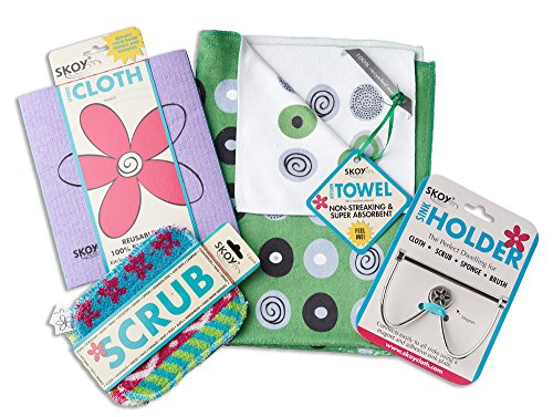This is a combination pack including 1 pack of Skoy Cloths (4) and 1 pack of Skoy Scrubs (2). Enjoy the perfect combination of these products for cleaning your kitchen and more! The Skoy Cloth is a fabulous, absorbent, biodegradable and natural multi-use cloth. Our re-usable earth friendly cloth is perfect in your kitchen, bathroom, and on most surface areas in your home or office. The Skoy Cloth can be used in place of your sponge, wash cloth or paper towels. It is made is Germany and is 100% biodegradable because it is made from a natural cotton (30%) and wood-based cellulose pulp (70%). The Skoy Cloth is a chlorine-free product using water-based colors and inks. Skoy Cloth is a durable product due to the reusability factor and can last months. Using a Skoy Cloth is equivalent to using 15 rolls of paper towels in an average home. The Skoy Cloth has an absorption factor of 15x its own weight. As a result, producing the most superior cloth product available. The Skoy Cloth is long-lasting because of the washability feature. It dries quickly, so it is not a breeding ground for bacteria. It is also dishwasher and washer/dryer safe. The Skoy Cloths in this combination pack have a flower print (4 colors randomly selected from orange, yellow, green, blue, pink, purple). Each Skoy Cloth is approximately 7"x7". It comes raffia tied with an information card to minimize packaging. The Skoy Scrub is a new concept in kitchen scouring pads. This reusable scrub made in Poland from cotton and non-toxic hardener outlasts traditional scrubbers and in turn saves money and controls waste. The Skoy Scrub comes in a variety of colors and designs which adds fun as well as function to any kitchen. These scrubs will replace the old green scouring pads or scrub sponges. The Skoy Scrub is not limited to the kitchen and works well on most surfaces. The scrubber is easily cleaned on the top rack of the dishwasher.Long lasting and durable
