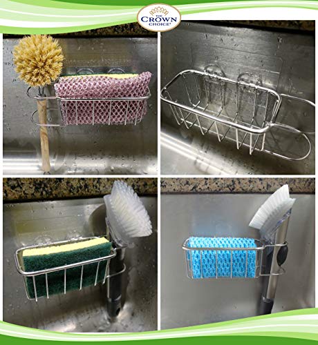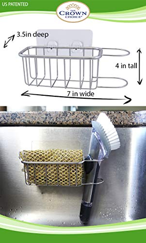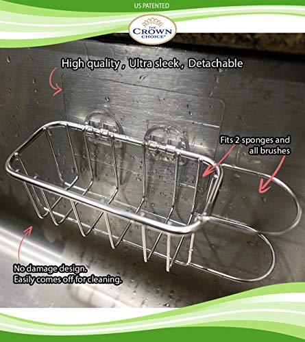 PATENTED STRONG SPONGE HOLDER: Our patented no suction strong sponge holder and brush sink caddy stays on with a powerful adhesive.