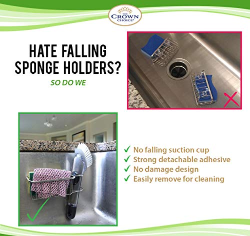 NO SUCTION, NO MAGNET = NO FALLING: Hate suction sponge holders that fall off? Not anymore. Our patented sponge holder is designed to stay put.PATENTED STRONG SPONGE HOLDER: Our patented no suction strong sponge holder and brush sink caddy stays on with a powerful adhesive.